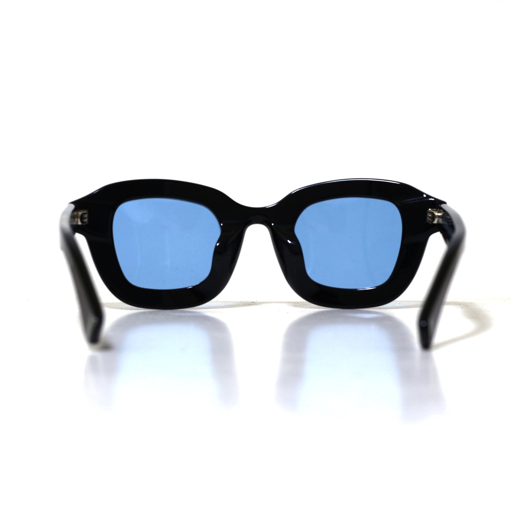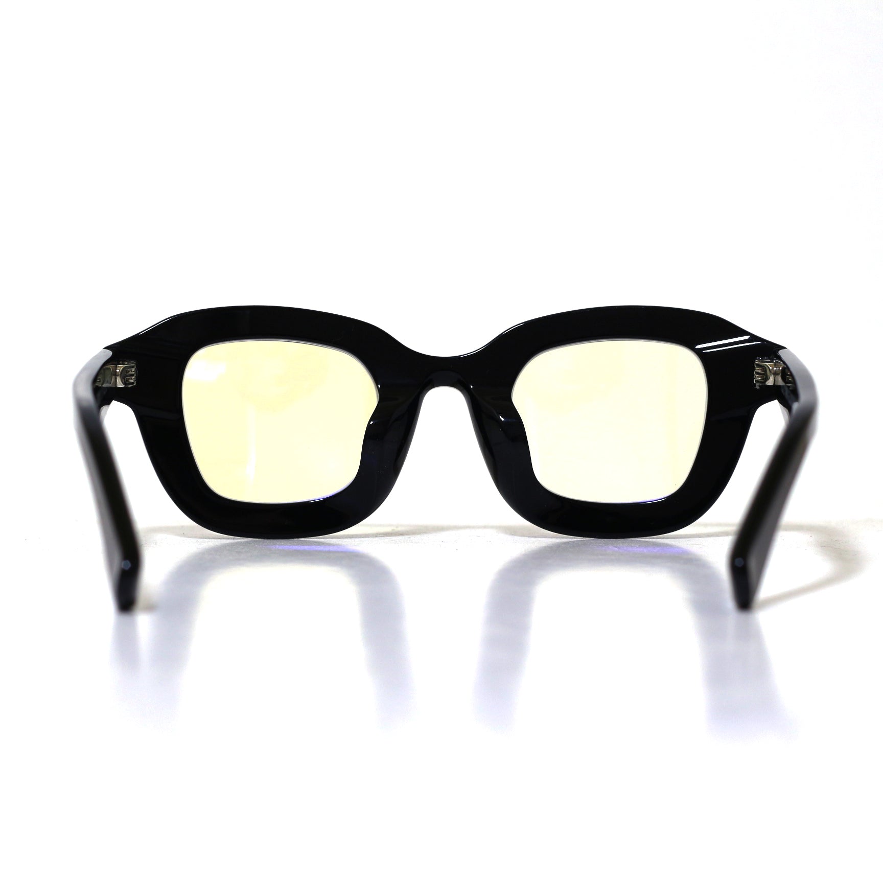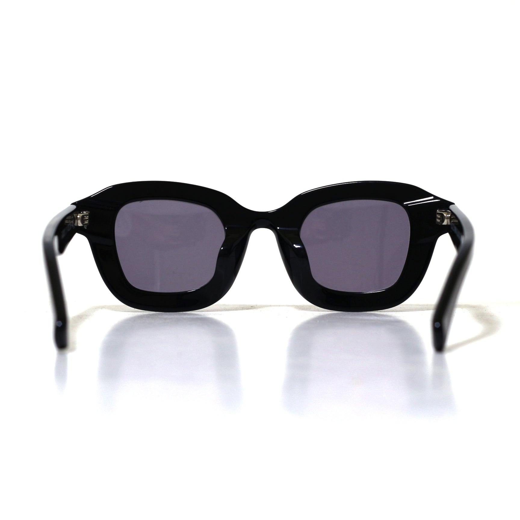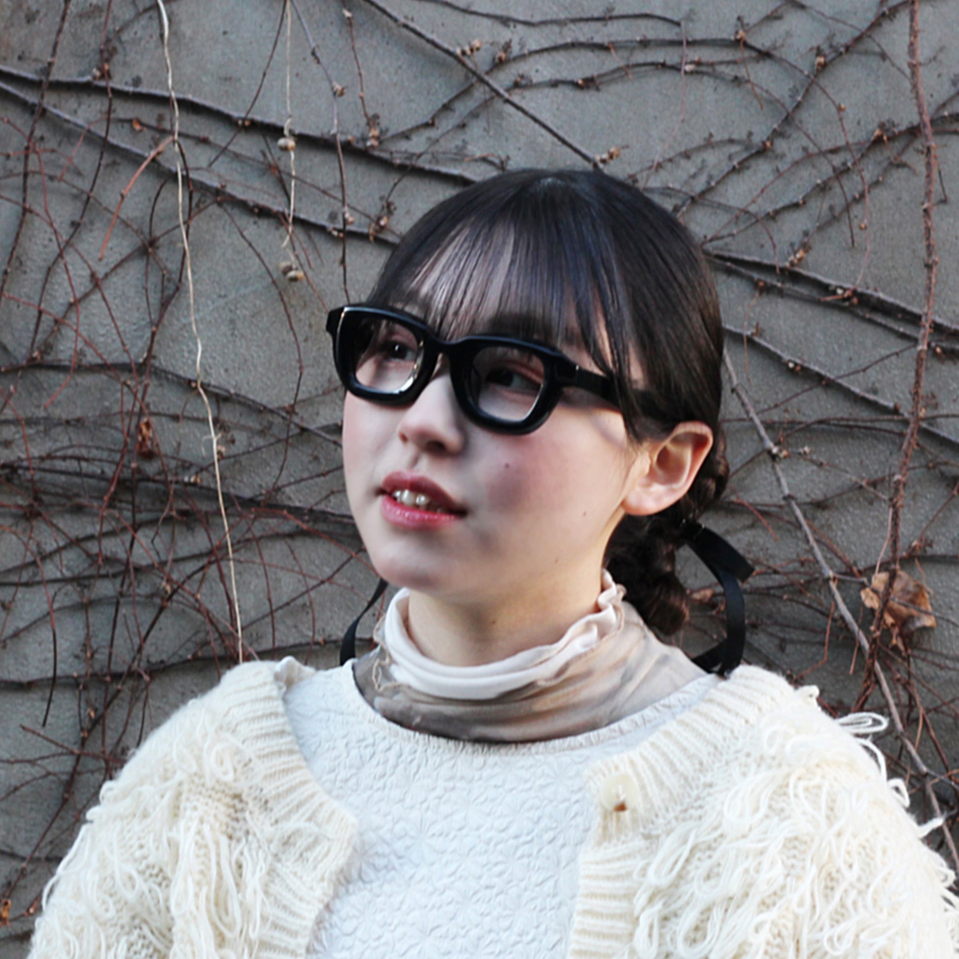 極太な黒縁フレームでインパクトを持ちつつ縁にカットを入れることにより